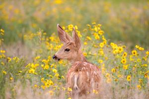 A deer fawn in the wildflowers at Garden of the Gods in Colorado Springs, Colorado.